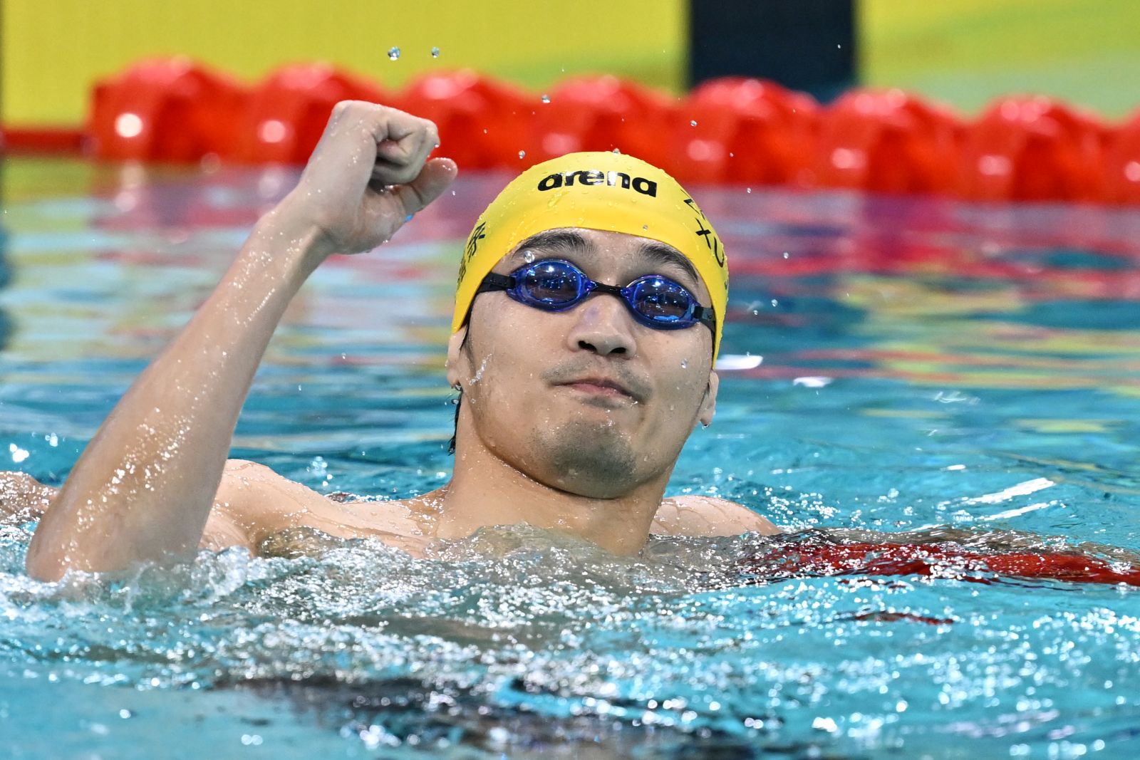 (浙江隊選手徐嘉餘在比賽後慶祝。他以24秒36的成績晉級決賽並刷新全國紀錄)