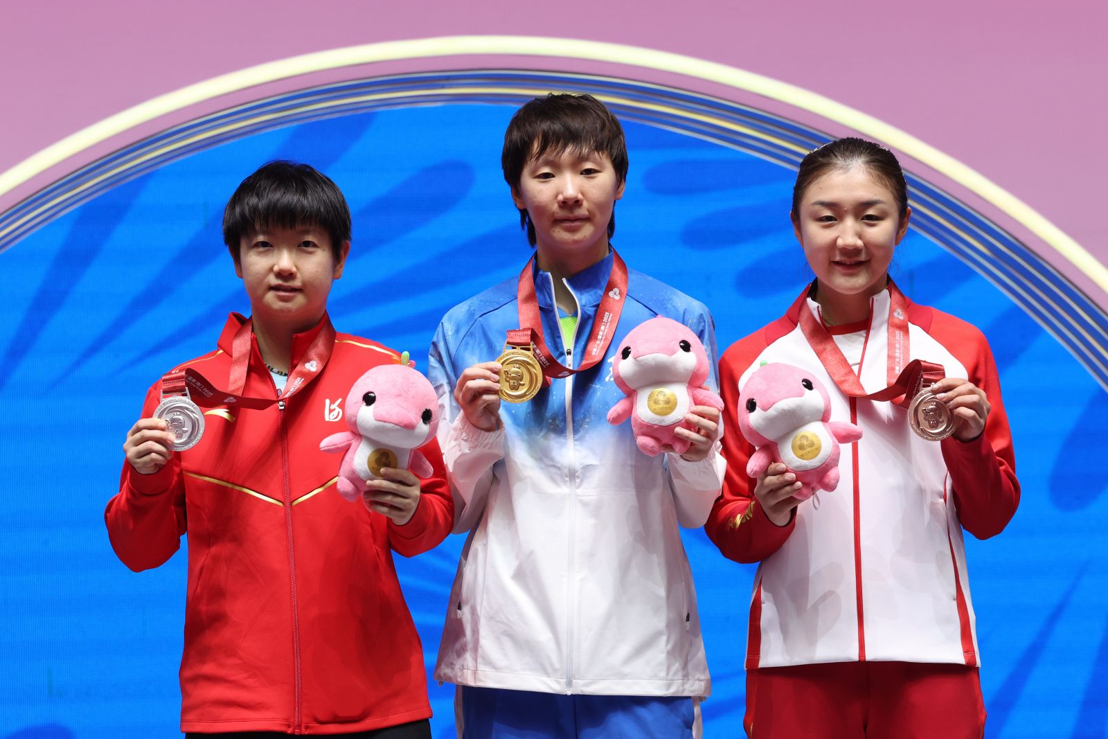 (冠軍黑龍江隊選手王曼昱(中)、亞軍河北隊選手孫穎莎(左)和季軍山東隊選手陳夢在頒獎典禮上合影)