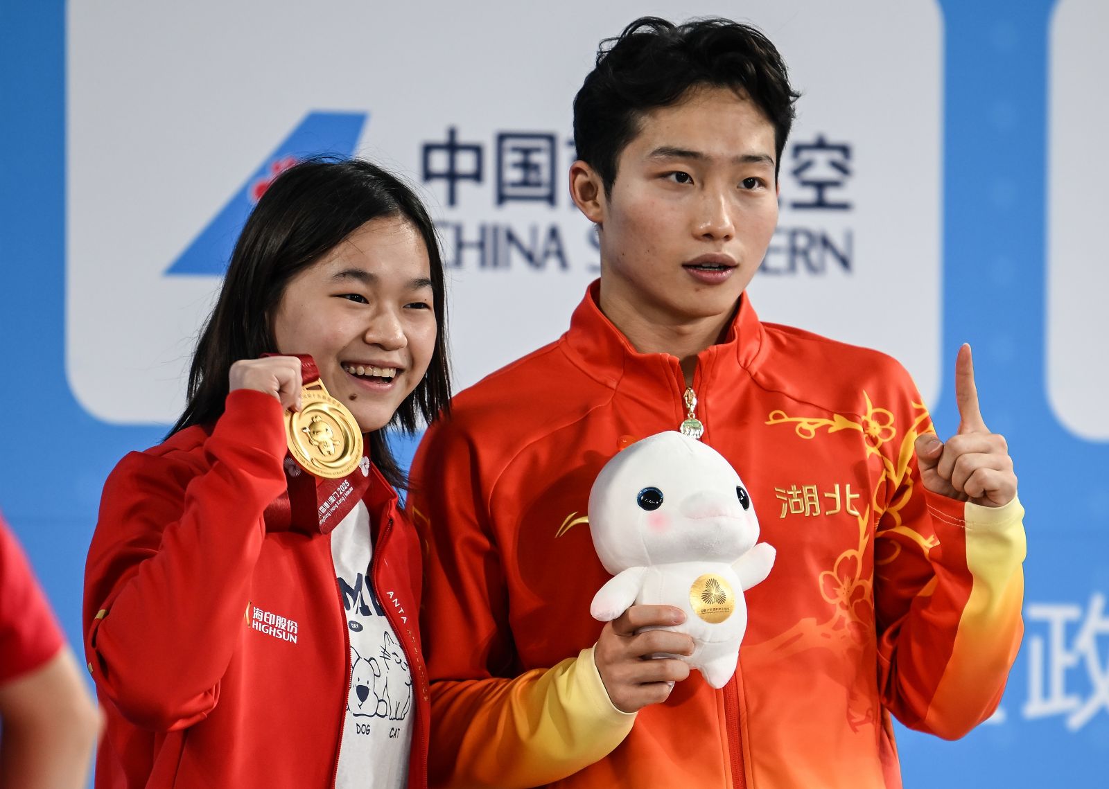 (11月10日,獲得冠軍的湖北隊選手王宗源(右)在頒獎典禮上與廣東隊選手全紅嬋合影)