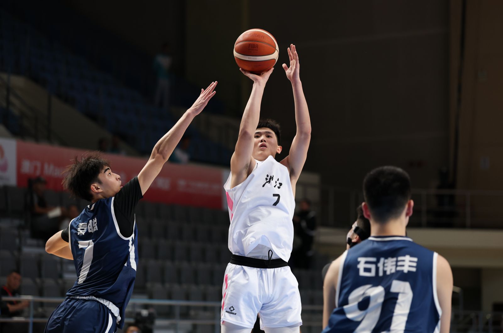 (11月10日,浙江隊球員李悅洲(中)在比賽中投籃。當日,在澳門舉行的第十五屆全國運動會籃球男子18歲以下組小組賽中,浙江隊以106比71擊敗湖南隊。)