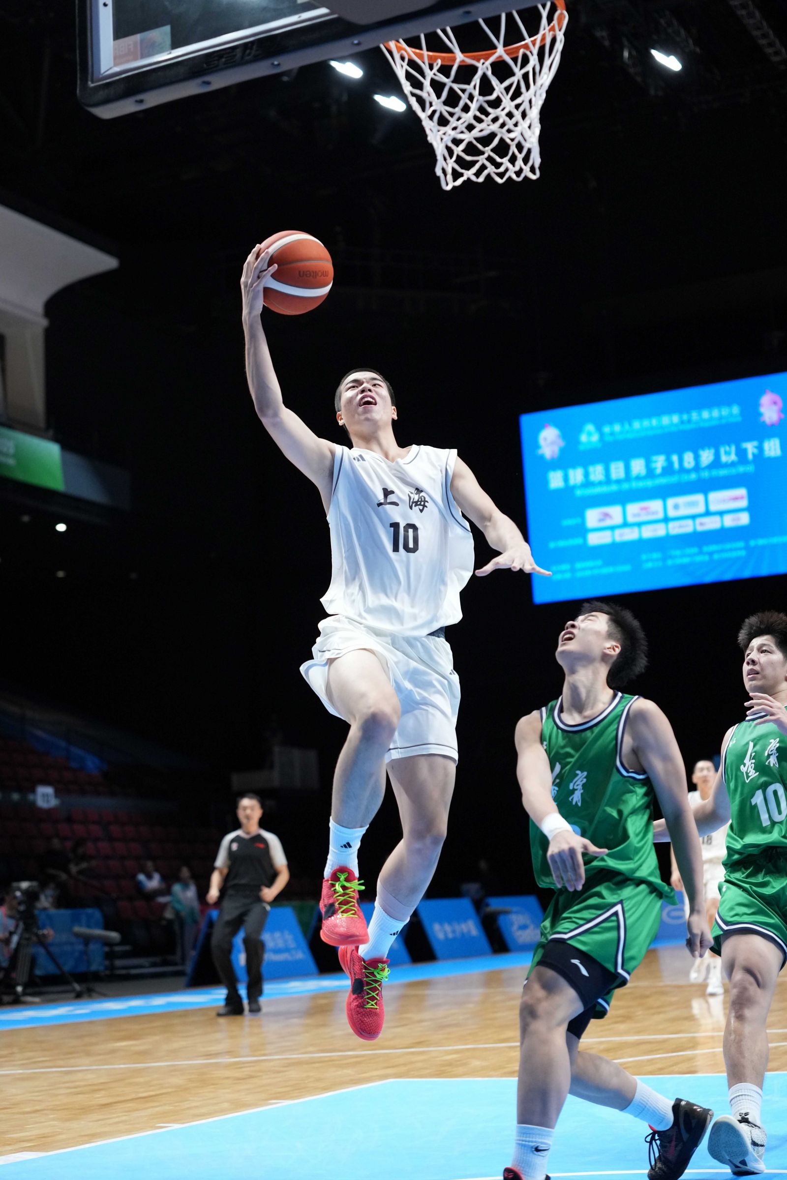 防守他的白隊10號是上海隊的張懿趙傑,出生於2010年的他身高超過2米,已經跳級打過不少U17、U18賽事,今年他隨U16男籃國家隊獲得亞洲杯亞軍併入選賽事最佳陣容。張懿趙傑並非用來專門消耗李悅洲的球隊苦力或藍領,而是勇於擔當,服從指揮的球隊主力。