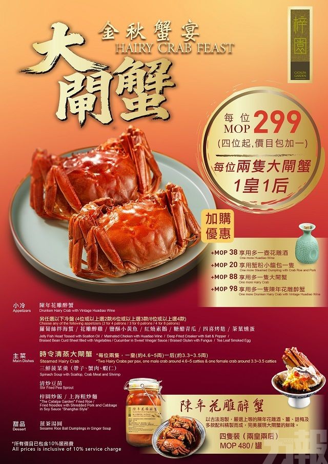 「大閘蟹時令臻味套餐」每位澳門幣299元(四位起,價目已包加一),除了每位兩隻清蒸大閘蟹,還包括陳年花雕醉蟹、多款精選冷盤、三鮮菠菜羹、清炒豆苗、主食及薑茶湯圓。六位或以上惠顧更贈送一壺花雕酒,為盛宴錦上添花。