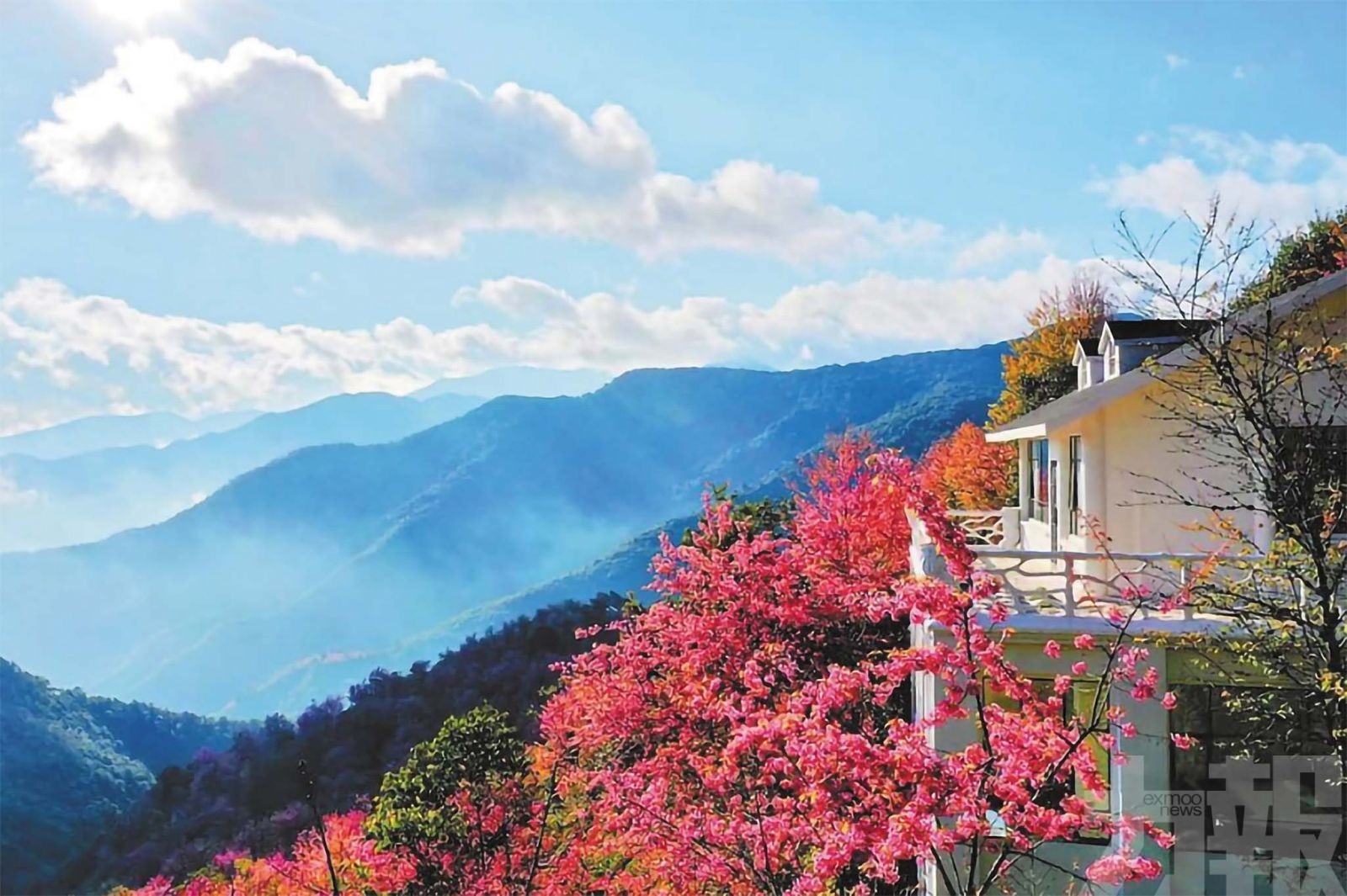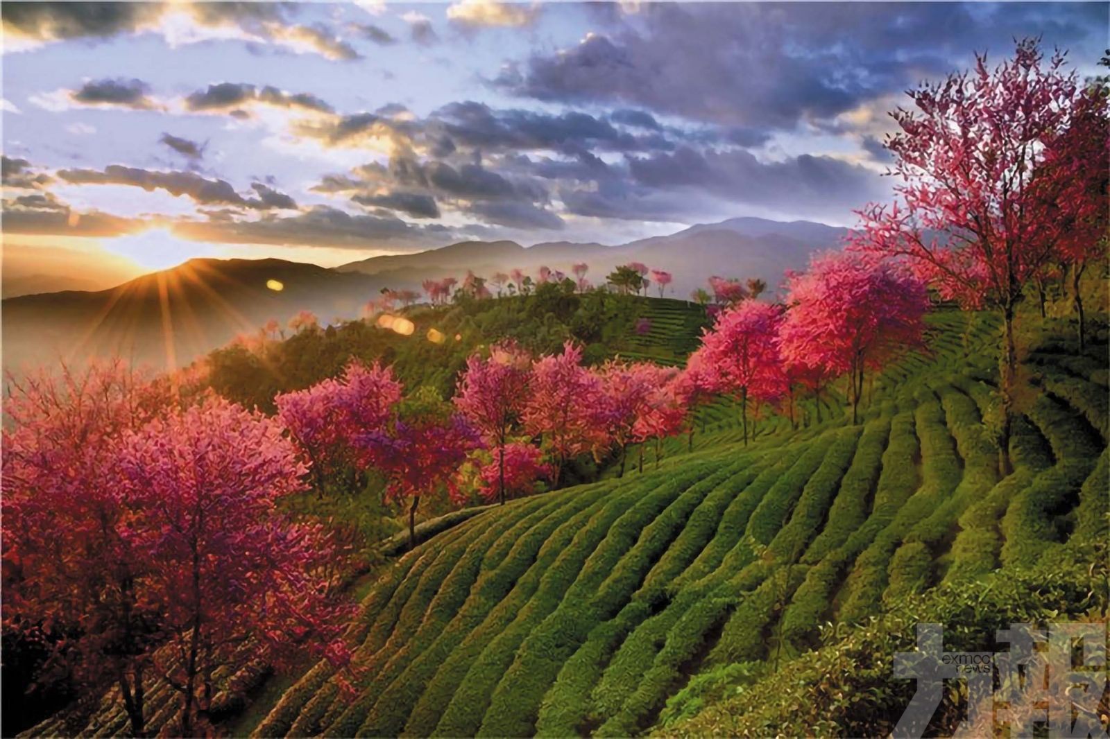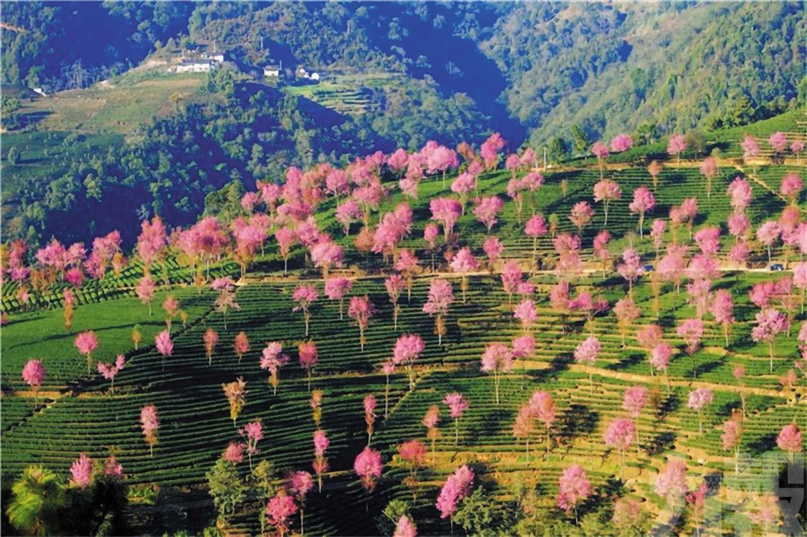 漫步谷中,彷彿闖入一幅流淌的油畫。層層疊疊的翠綠茶壟,是大地鋪就的絨毯;一樹樹緋紅粉白的冬櫻,如肆意潑灑的顏料,在晨霧與光影中暈染開來。當清晨的薄霧如輕紗般籠罩山谷,陽光穿透雲層,形成一道道「耶穌光」,櫻花在光暈中更顯嬌媚靈動,宛若金庸筆下「神仙姐姐」居住的秘境,虛無縹緲,仙氣十足。