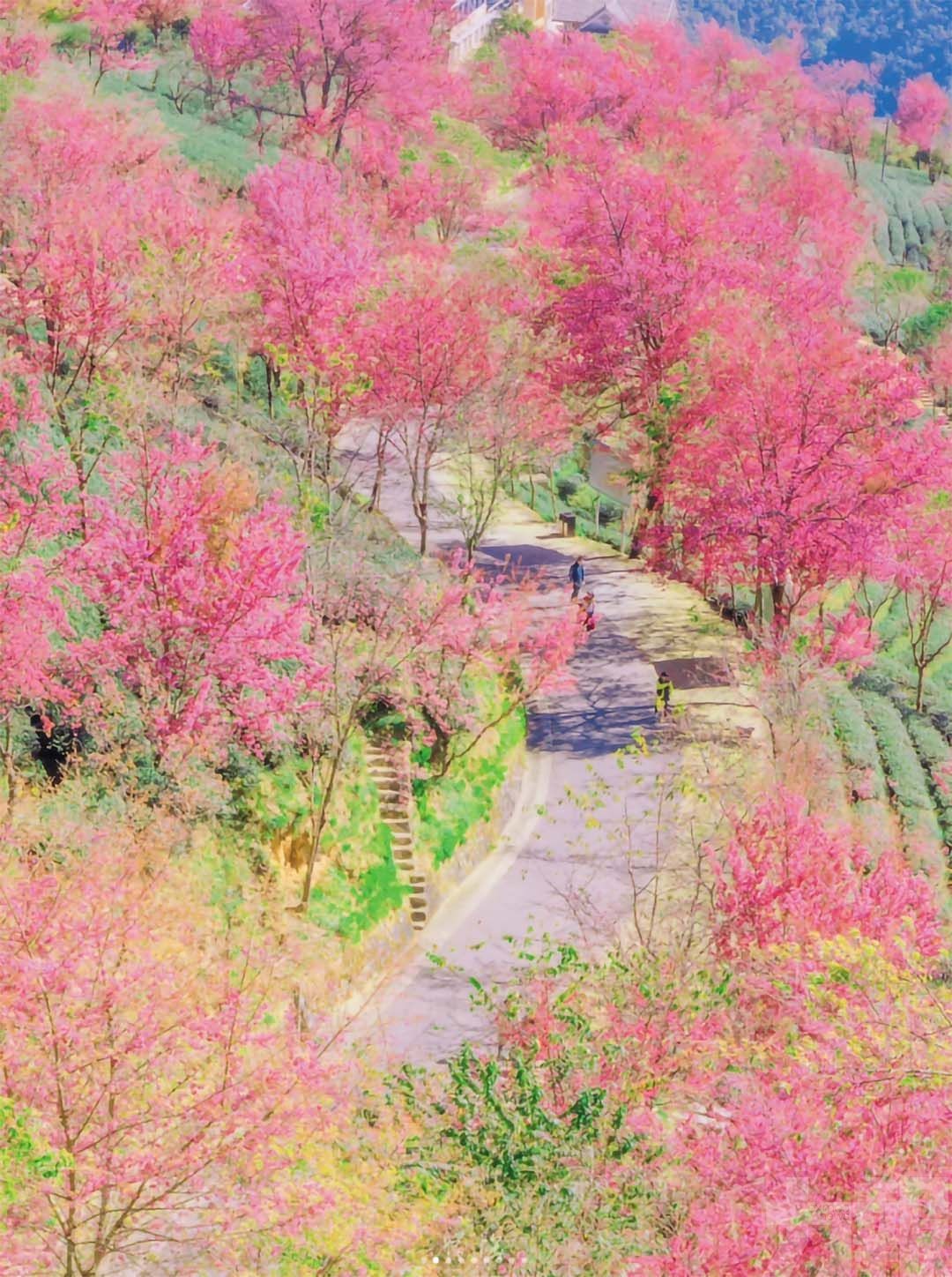 徜徉茶櫻之間:穿行在茶園小徑,讓左右兩旁的花枝輕撫肩頭,深吸一口氣,是清冽空氣中混雜的淡淡花香與茶香。