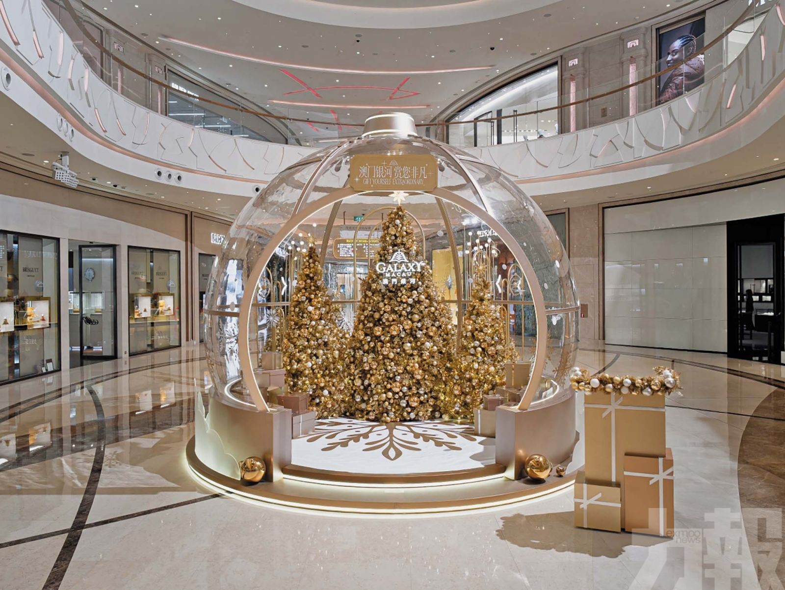 時尚大道東的巨型水晶球景觀裝置使「 澳門銀河 」的冬季節慶之旅幻化成數碼體驗,利用AR技術實現沉浸式雪境體驗。 (銀河娛樂集團圖片)