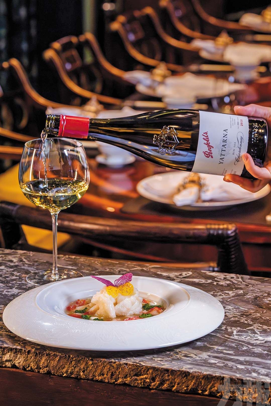 御花園的精緻菜式——珊瑚牡丹虎蝦球,與層次豐富的奔富佳釀相得益彰,讓賓客深刻體驗美酒與佳餚交織的巧妙韻味。(澳娛綜合提供圖片)