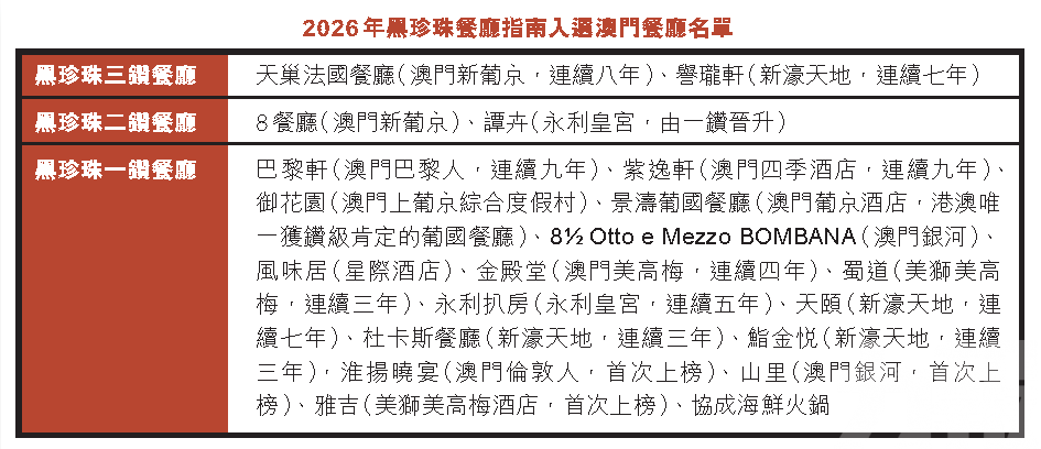 被譽為「中國米其林」的黑珍珠餐廳指南,2026 年度港澳台及海外地區頒獎禮於昨(23)日在濱海灣金沙舉行,來自7座城市的135家餐廳入選,上榜數量較去年增長18.4%。其中,澳門共有20家餐廳成功入選,彰顯了澳門作為美食天堂的非凡魅力。而這些入選的餐廳中,大多數為博彩企業旗下的高端餐飲品牌,進一步提升了澳門餐飲業的國際知名度。