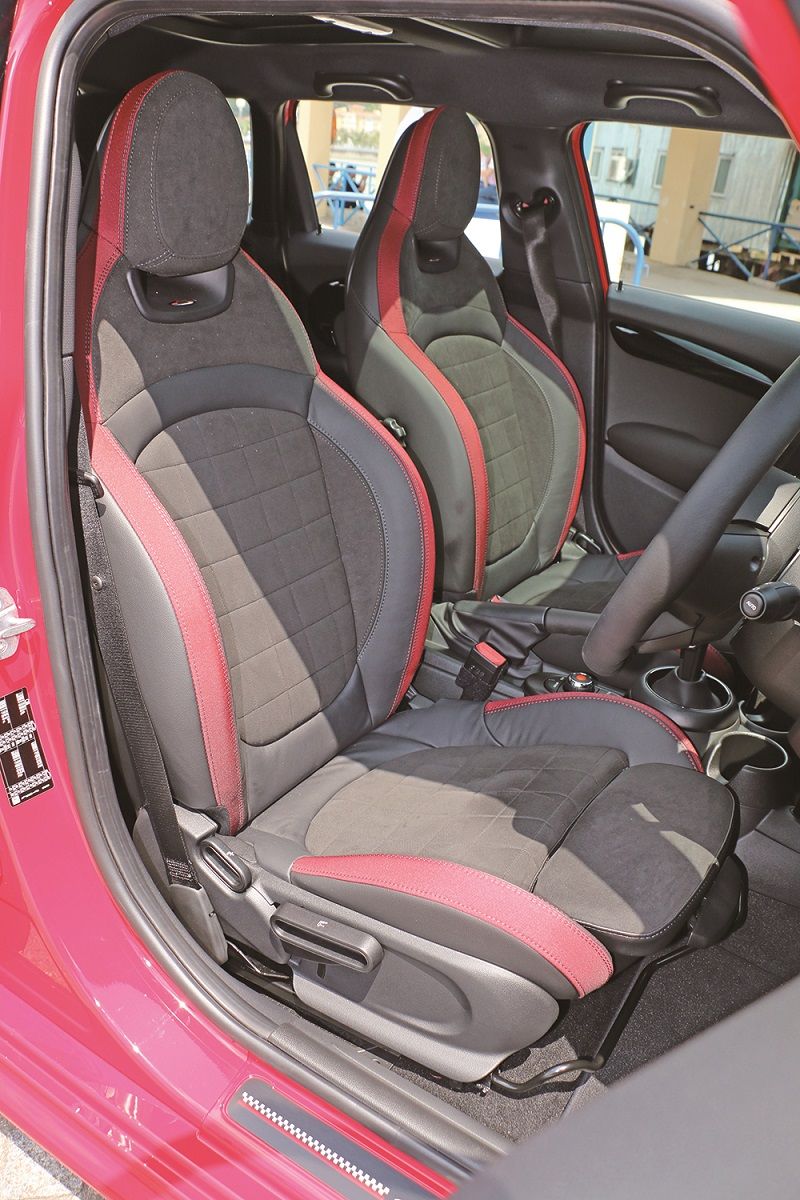 外觀配以動感十足的JCW套件,內櫳設計亦夠「貼地」。內櫳以全黑為主,除了搶眼的JCW灰麂皮+紅真皮飾邊的前排運動座椅之外,儀錶台亦採用12色滲光米字旗飾板,配合JCW專屬的門檻、鋁合金腳踏,跑車皮軚環亦以紅色雙縫線點綴,跑味甚濃。而全新MINI 5-Door的車速錶右側油量計已由橫置改成直立顯示;MINI駕駛模式轉換掣更由原本波棍位置調至中控台,以復古的上下按剔方式選擇,操作更就手。重點是設有6.5吋Radio MINI VisualBoost多媒體觸控屏幕、中央控制器、USB接口及藍牙連接、後視鏡頭及原廠音響系統等,設備豐富。
